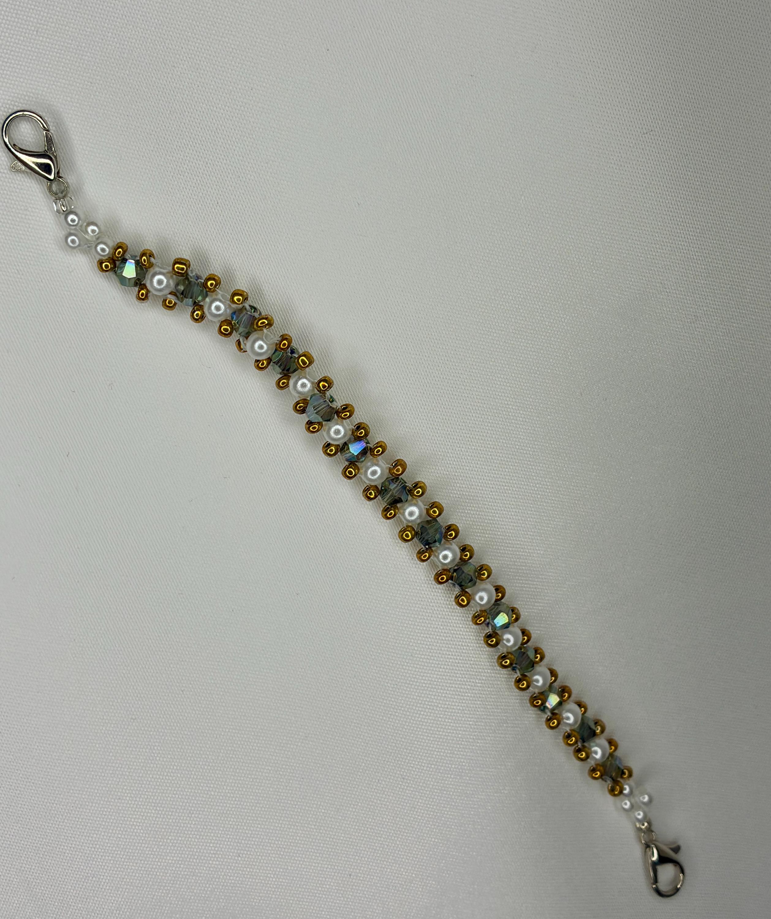 The crystal beads are complemented by white, round artificial pearls and fine seed beads, which give the design a harmonious structure and a delicate elegance.