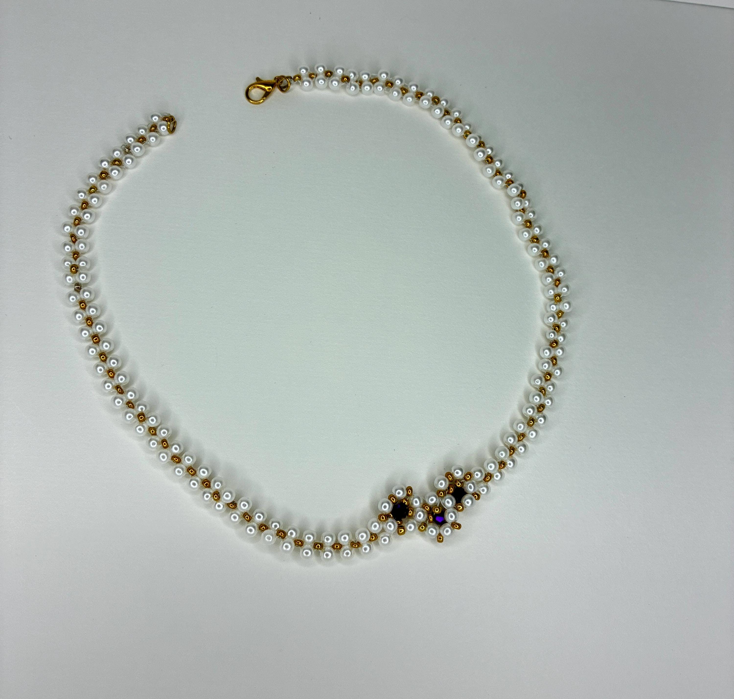 The crystal beads are complemented by white, round artificial pearls and fine seed beads, which give the design a harmonious structure and a delicate elegance.