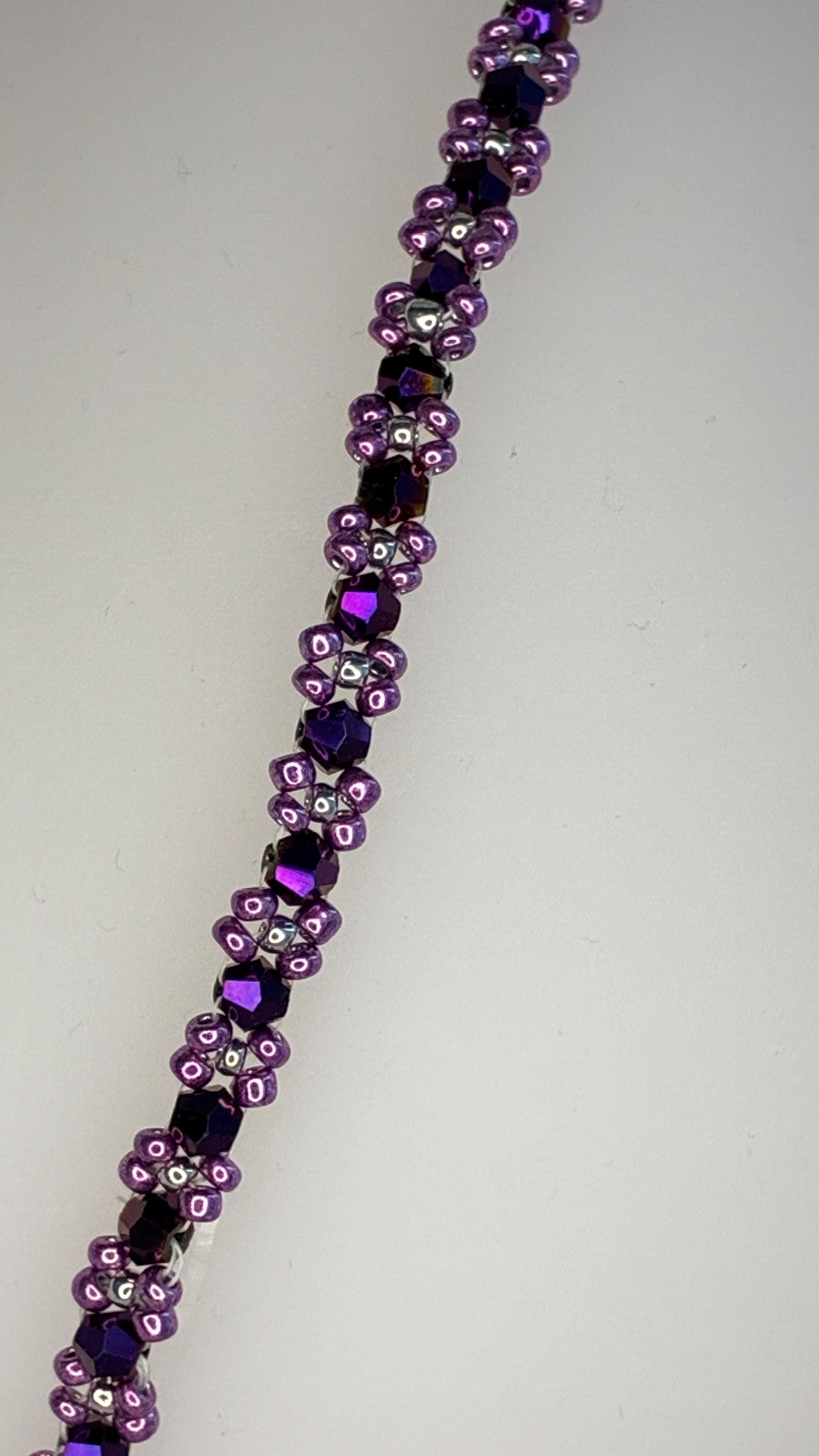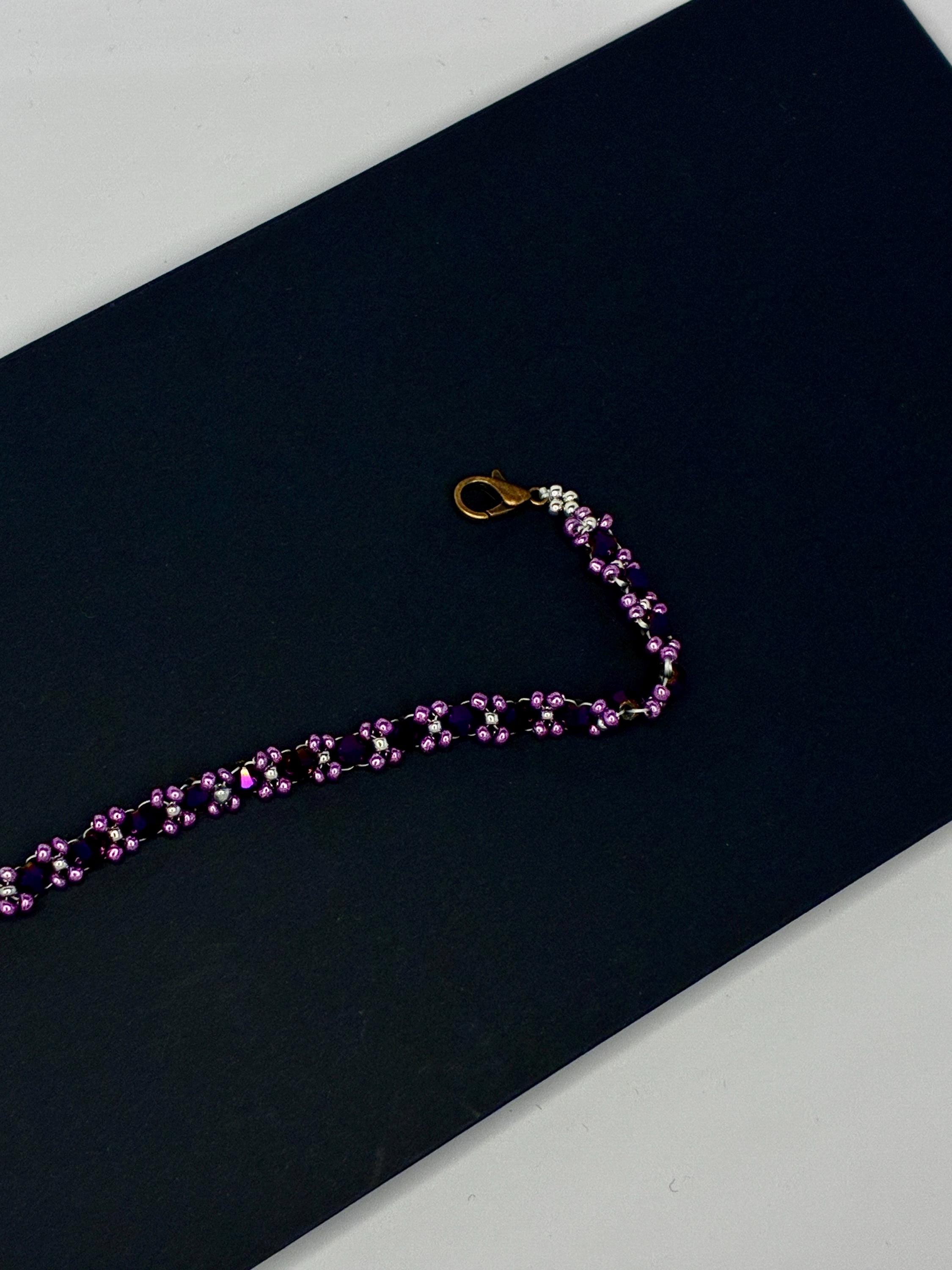 The crystal beads are complemented by white, round artificial pearls and fine seed beads, which give the design a harmonious structure and a delicate elegance.